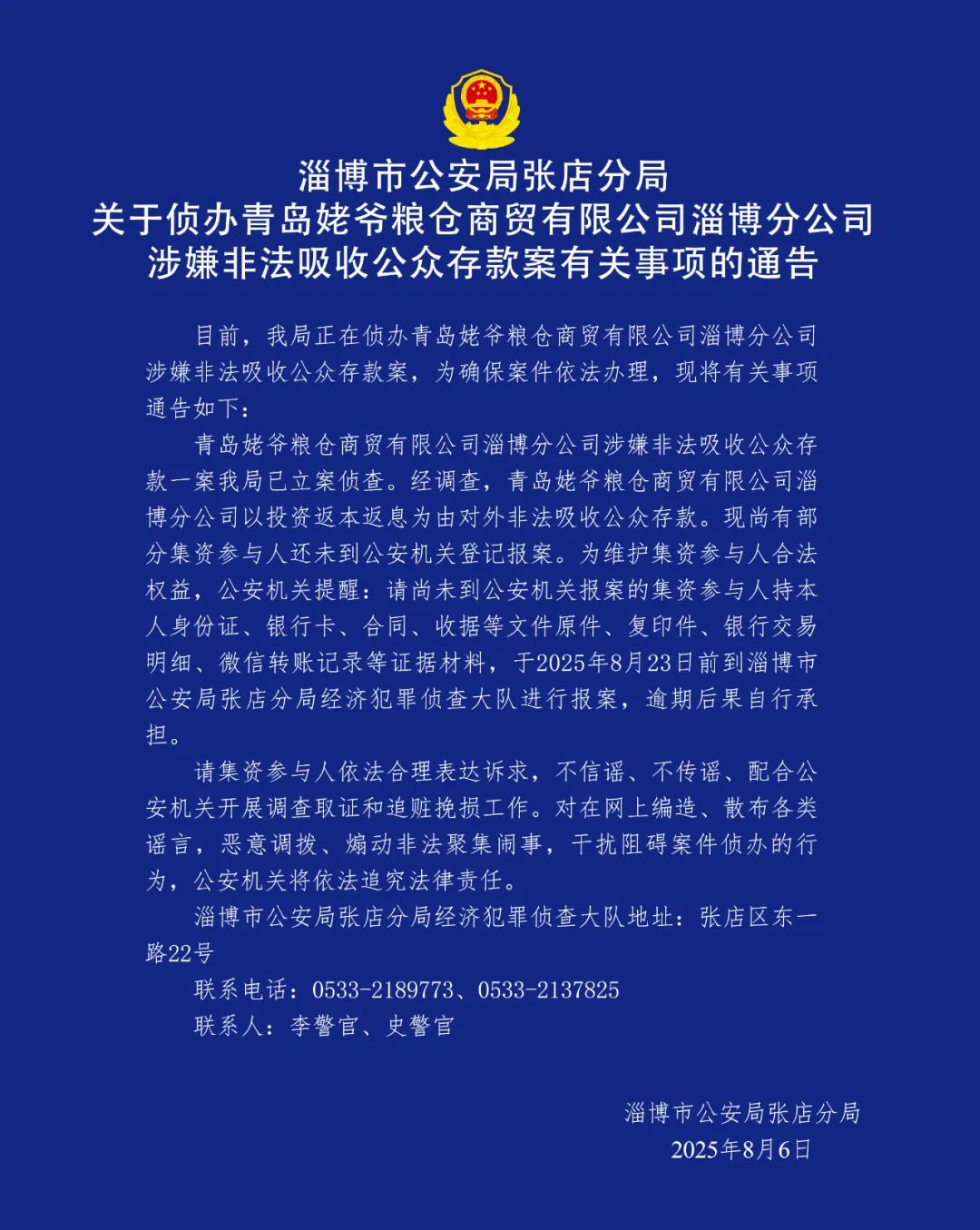 淄博市公安局张店分局关于侦办青岛姥爷粮仓商贸有限公司淄博分公司涉嫌非法吸收公众存款案有关事项的通告