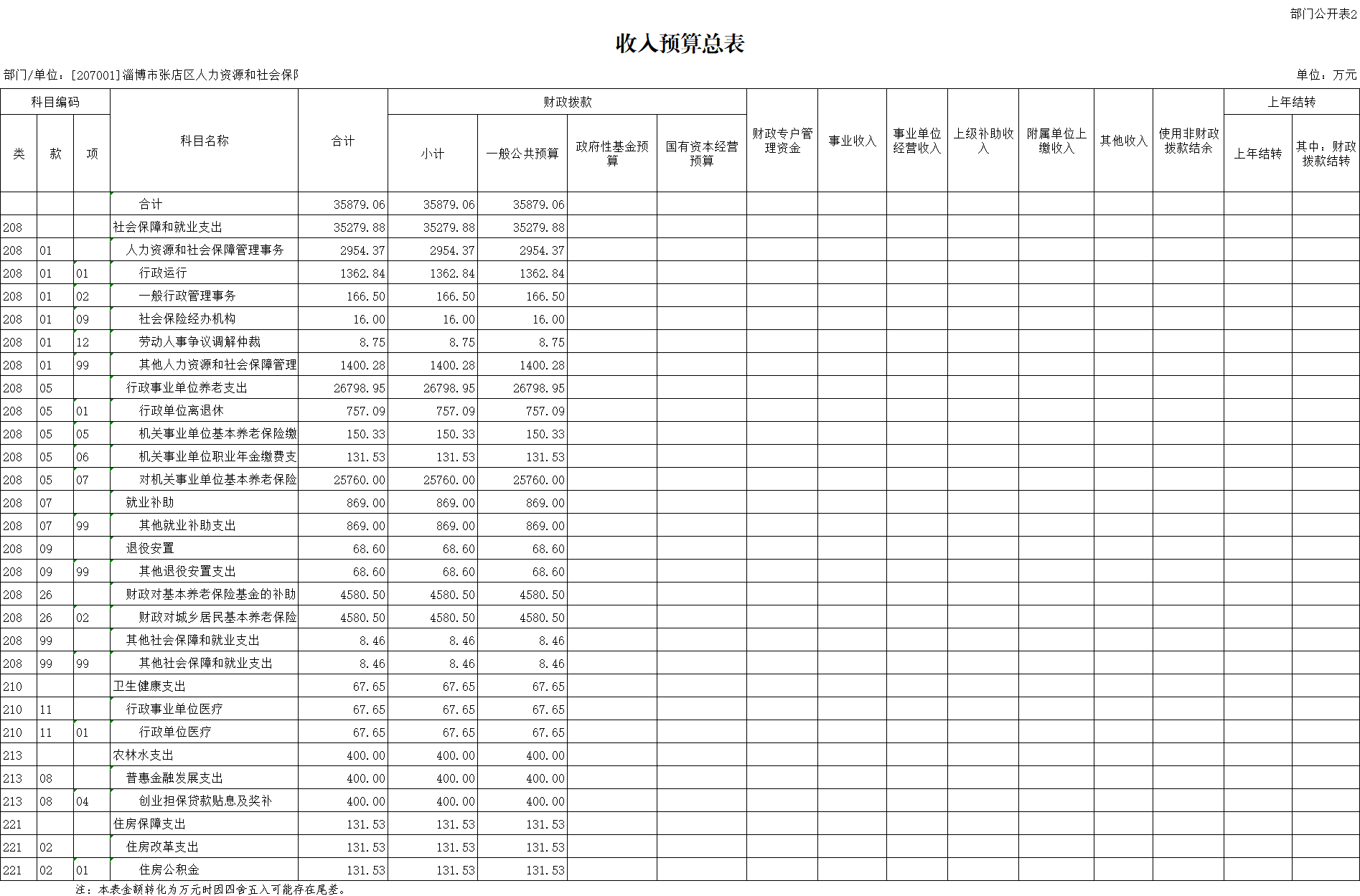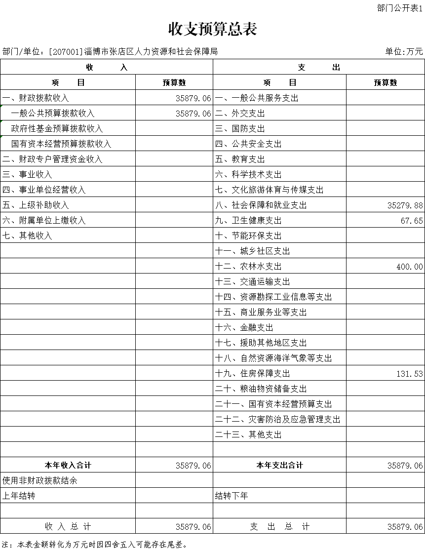 淄博市张店区人力资源和社会保障局2022年财政拨款收支总预算为35879.06万元。收入包括:一般公共预算35879.06万元,占100.00%。