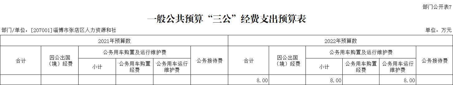 2022年淄博市张店区人力资源和社会保障局通过一般公共预算财政拨款安排的“三公”经费预算共8.00万元,比上年减少1.78万元,下降18.20%,主要原因是2022年公务接待未单独设立预算。其中:因公出国(境)费0.00万元,与上年持平。公务用车购置及运行费8.00万元,包括公务用车购置费0.00万元,与上年持平;公务用车运行维护费8.00万元,比上年增加0.30万元,增长3.90%,主要原因是2021年劳动监察大队车辆部分费用列入办公费用。公务接待费0.00万元,比上年减少2.08万元,主要原因是2022年,系统中未对公务接待项目取数,公务接待2.08万元已列入办公经费。