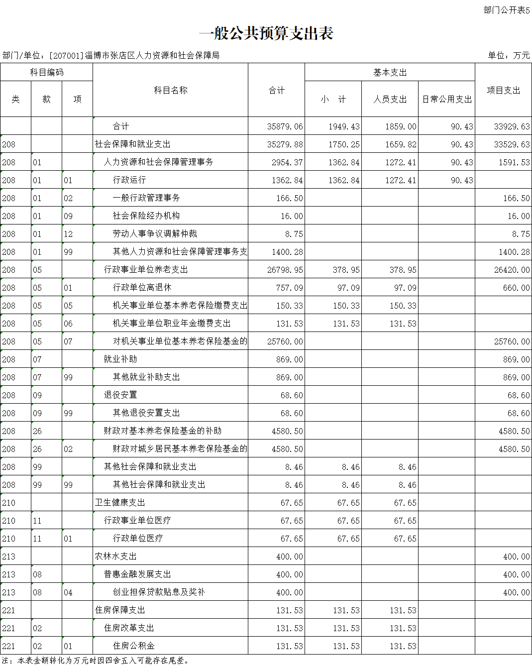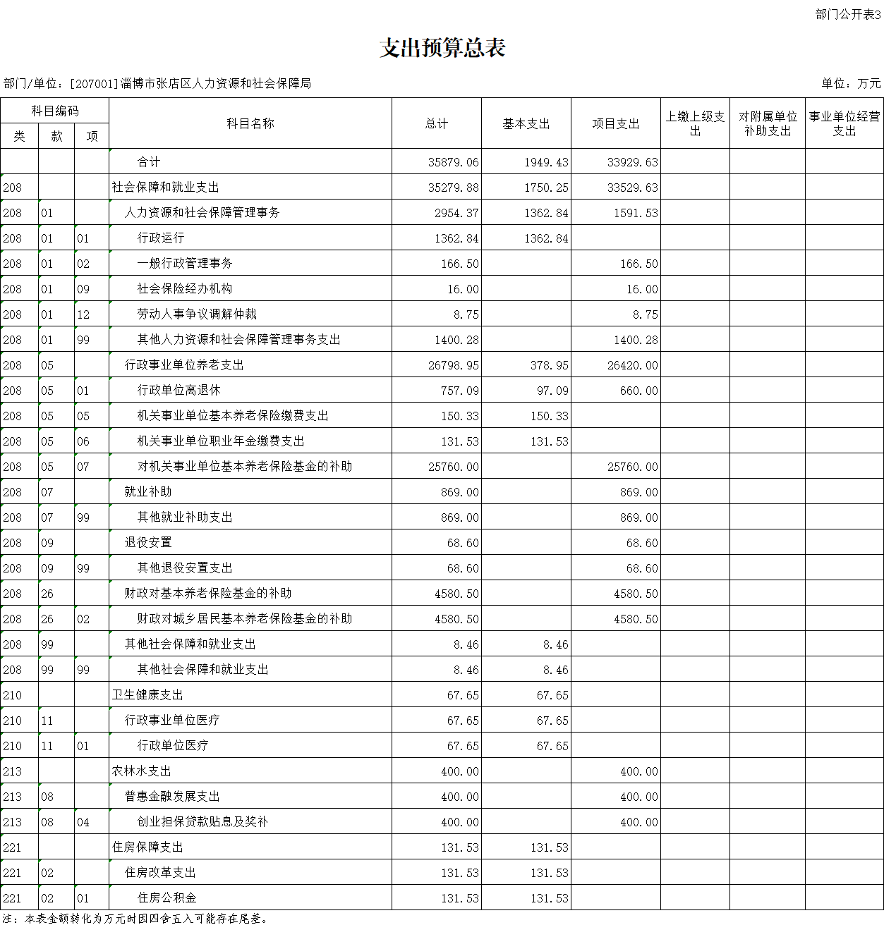 淄博市张店区人力资源和社会保障局2022年支出预算为3587 9.06万元,其中:基本支出1949.43万元,占5.43%,项目支出33929.63万元,占94.57%。