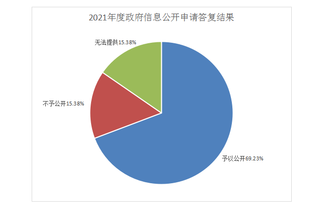 淄博市张店区综合行政执法局加强服务理念,规范答复文书格式,把依申请公开工作作为服务人民群众的重要方式,按时办结2021年政府信息公开申请13宗,申请内容主要集中在智慧停车停车位、行政裁量基准、行政处罚具体行政行为等领域。共作出政府信息公开申请答复书13件,其中予以公开9件,占69.23%;不予公开2件,占15.38%;无法提供2件,占15.38%。